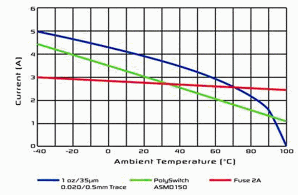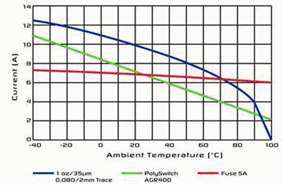 必須注意的是,在整個(gè)溫度范圍內(nèi),PPTC器件的觸發(fā)電流是如何跟隨印制線上的電流。在這兩種情況中,即使可以使用熔斷器,在汽車高于有用的標(biāo)準(zhǔn)溫度下,尺寸最接近的熔斷器也不能保護(hù)它。