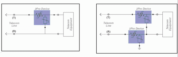 2Pro器件符合RoHS標(biāo)準(zhǔn),它把PolySwitch PPTC過流保護(hù)技術(shù)和金屬氧化物壓敏變阻器(MOV)集成在一起,構(gòu)成一個過熱保護(hù)器件,在出現(xiàn)過流現(xiàn)象時抑制電流,在發(fā)生過壓現(xiàn)象時對電壓進(jìn)行箝位。這種單器件做法,有助于減少元件數(shù)量、提高設(shè)備的可靠性。圖1說明了在不接地和接地兩種電路保護(hù)方案中如何使用2Pro器件。