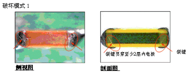 貼片式陶瓷電容的內(nèi)部裂縫能引起嚴(yán)重的破壞。如果在PCB組裝過程中,貼片式陶磁電容器招受到剪應(yīng)力,一種板彎裂縫將會在陶磁內(nèi)部產(chǎn)生,這些裂縫有可能貫穿電容內(nèi)部多層內(nèi)部正負(fù)電極層,這樣可能導(dǎo)至短路的風(fēng)險。典型的板彎破壞裂縫模式如下圖所示。這些短路模式可能導(dǎo)至電容過熱而造成嚴(yán)重的燒毀熔融現(xiàn)象。