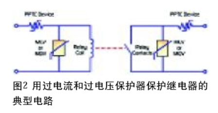 圖2是保護(hù)繼電器的一種典型電路。PPTC保護(hù)器是是與繼電器繞組串聯(lián)著,在出現(xiàn)故障或者發(fā)生意外的過載時,它限制繼電器中流過的電流。這個圖中,還有一個 PPTC保護(hù)器與繼電器的觸點(diǎn)串聯(lián)著,它起的作用與保護(hù)繼電器繞組是一樣的。在選擇PPTC保護(hù)器時,很重要一點(diǎn)是它的額定電壓要等于或高于預(yù)期的最高電壓。還要求保護(hù)器的保持電流必須等于或大于正常運(yùn)作時的最大穩(wěn)定狀態(tài)電流。此外,還要考慮到最高環(huán)境溫度,這是因?yàn)殡S著環(huán)境溫度上升,保持電流下降。