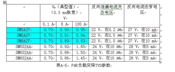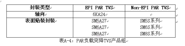 Vishay有兩種類型的汽車電子初級保護負載突降TVS:EPI PARTVS和Non-EPI PARTVS。PAR TVS的產(chǎn)品組列在表A-4當中。