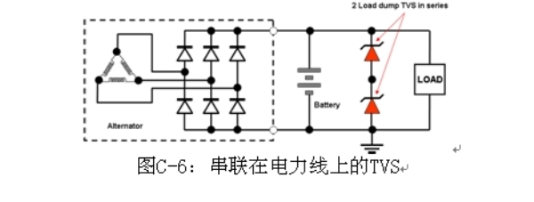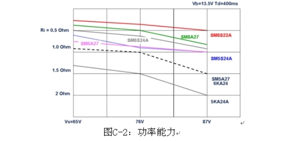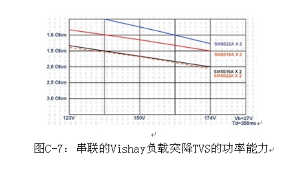 圖C-6是兩個串聯(lián)TVS的典型應用,圖C-7是各種線路電阻和電壓條件下兩個串聯(lián)的負載突降TVS的功率能力。