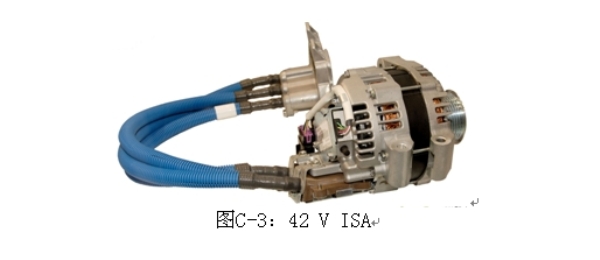 用于中型混合動力系統(tǒng)的ISG(集成式起動機/發(fā)電機),輕型汽車為14 V,120 A,而在制動和停車期間沒有燃料噴射時,空轉(zhuǎn)引擎為42 V,60至80 A輸出。