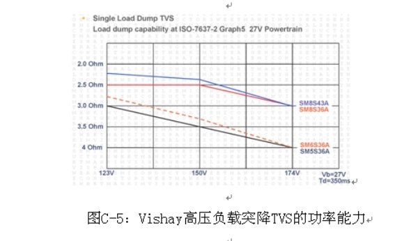 圖C-4考慮到了汽車電子中半導體的最大輸入電壓的約定是75 V的需求,某些Vishay負載突降系列可以滿足42 V電源系統(tǒng)的要求。
