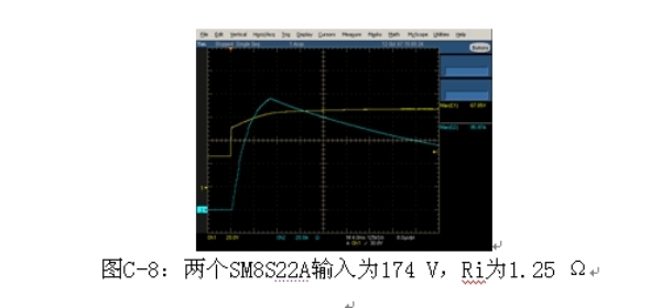 負載突降測試的波形如圖C-8所示,最大箝位電壓為174 V,Ri=1.25 Ω時為6 V±1V,流經(jīng)負載突降TVS的電流是95至100 A。這將使42 V電源網(wǎng)絡(PowerNet)半導體電平的精度比75 V更低,汽車中每個電子單元的次級保護器件可在這個箝位電壓與最大工作電壓之間的范圍進行箝制。