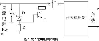 圖3為用晶體管和繼電器所組成的保護電路,在該電路中,當輸入直流電源的電壓高于穩(wěn)壓二極管的擊穿電壓值時,穩(wěn)壓管擊穿,有電流流過電阻R,使晶體管T導通,繼電器動作,常閉接點斷開,切斷輸入。輸入電源的極性保護電路可以跟輸入過電壓保護結(jié)合在一起,構(gòu)成極性保護鑒別與過電壓保護電路。