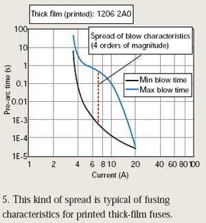 源于這種阻值變化,芯片保險(xiǎn)絲可能在正常浪涌電流條件下熔斷?;蚍催^(guò)來(lái)說(shuō),它也可能在過(guò)載條件下需要熔斷時(shí)而沒(méi)能熔斷。當(dāng)然,這是工程師必須避免的最壞情況。圖5顯示了印刷厚膜保險(xiǎn)絲熔斷特性的典型擴(kuò)散。
