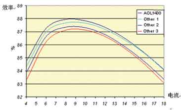 注意到圖2中,除了柵極結(jié)構(gòu),其他的部分就是標準的采用Trench工藝的MOSFET。柵極被分割成上下兩個部分,下部分用一些特殊的材料屏蔽起來,下部分在內(nèi)部和上部分的柵極相連,而柵極的屏蔽層被連接到源極,從而減小漏極柵極米勒電容。用這種技術(shù)設(shè)計的MOSFET如AOL1464,其Vds為30V,Vgs在10V條件下Rds(on)為6.2mΩ,而其Crss只有20pF,極大地減小了開關(guān)過程中米勒平臺的持續(xù)的時間,降低了開關(guān)損耗。AOL1430,其Vds為30V,Vgs在10V條件下Rds(on)為2.5mΩ,而其Crss為50pF。圖3中,下管采用AOS的AOL1428,上管采用AOL1430和其他廠家目前Crss最低的器件的效率曲線,可見,上管采用AOL1430具有非常高的效率。注意:輸入電壓12V,輸出電壓 1.7V,開關(guān)頻率300kHz。