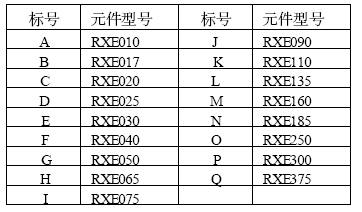 RXE系列PolySwitch元件20℃時(shí)的動(dòng)作保護(hù)特性曲線見圖1。其中橫坐標(biāo)表示故障電流,單位為安培,縱坐標(biāo)表示動(dòng)作時(shí)間,單位為秒。兩個(gè)坐標(biāo)軸均為對數(shù)坐標(biāo)。圖中每一條曲線對應(yīng)一個(gè)型號(hào)的元件,構(gòu)成該系列元件的動(dòng)作保護(hù)特性曲線簇。表2為圖1中曲線標(biāo)號(hào)與元件型號(hào)的對照表。
