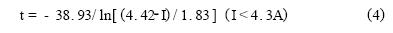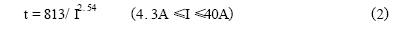 由表1可知,RXE系列PolySwitch元件所能承受的最大電流為40A。該點(diǎn)與臨界點(diǎn)之間為曲線的直線部分。設(shè)動(dòng)作時(shí)間為t(秒),故障電流為I(安),考慮到橫軸、縱軸均為對數(shù)坐標(biāo),兩者之間應(yīng)具有如下數(shù)學(xué)關(guān)系: