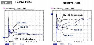 從圖3所示的圖上可見,顯然,與兩個(gè)競爭對(duì)手的器件(藍(lán)色波形)相比較,安森美半導(dǎo)體保護(hù)解決方案(黑色波形)可提供更低的ESD脈沖箝位電壓。與KEC的18V和Rohm的23V相比較,安森美的器件將正脈沖箝位在14V。而在負(fù)脈沖期間,這三個(gè)器件之間箝位電壓的差異更加明顯。安森美、競爭對(duì)手2和競爭對(duì)手1的器件對(duì)負(fù)脈沖的箝位電壓分別是20V、34V和42V。