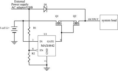 另外,MAX4842的過(guò)壓保護(hù)門(mén)限為4.4V-5.0V,也高于單節(jié)鋰電的4.2V上限電壓。電源切換電路是利用MAX4842的使能控制引腳/EN配合分壓電阻R1/R2實(shí)現(xiàn)的。當(dāng)沒(méi)有外部電源接入時(shí),如果電池電壓高于2.8V-3.2V的保護(hù)門(mén)限,/EN被R2拉低,MAX4842驅(qū)動(dòng)Q1、Q2的柵極為高電平使其導(dǎo)通,電池為負(fù)載供電;當(dāng)有外部電源接入時(shí),通過(guò)R1/R2分壓后在/EN引腳上產(chǎn)生的電壓高于1.47V后MAX4842被禁止,Q1、Q2被關(guān)閉,由外部電源給負(fù)載供電。圖中的二極管D2用于阻斷灌入外部電源的反向電流,并防止/EN被錯(cuò)誤拉高。由于它串在外部供電通路上,損失一點(diǎn)效率沒(méi)有關(guān)系。