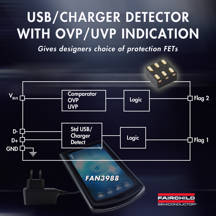 FAN3988具備內(nèi)置自動檢測功能,器件通過連續(xù)監(jiān)控短路條件下的D+ / D-線,能夠感測是否連接USB充電器。此外,器件還通過監(jiān)控VBUS來感測過壓或者欠壓狀況。當達到過壓閾值時,F(xiàn)AN3988立即禁用外部P溝道MOSFET。這些功能減小了設計的復雜性,并省去外部電路,節(jié)省了線路板空間。這款新型OVP器件是滿足新興過壓保護標準要求的理想選擇,對于手機尤為適合。