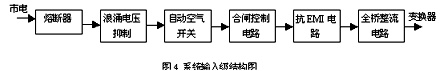 在開(kāi)關(guān)整流模塊中,輸入級(jí)的結(jié)構(gòu)如圖4所示。從圖中可知,此部分主要由熔斷器、浪涌電壓抑制電路、自動(dòng)空氣開(kāi)關(guān)、合閘控制電路、抗EMI電路等組成。