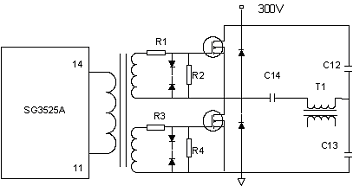 本設(shè)計(jì)中,選用變壓器驅(qū)動(dòng)方式,變壓器選用的是EI-28鐵氧體磁芯(寬28mm×高20.5mm×厚11.0mm)。由于SG3525A的供電電壓15V,驅(qū)動(dòng)變壓器的副邊繞阻需要稍許降壓,并且在柵極與源極之間并聯(lián)箝位穩(wěn)壓二極管,以防范柵極浪涌電壓損壞IRFP450功率開(kāi)關(guān)管,如圖5所示。