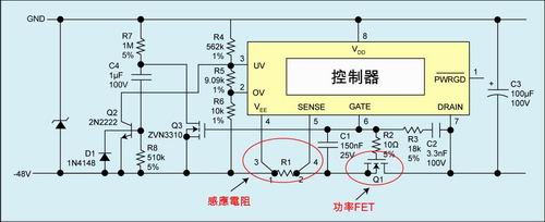 智能型熱插拔(SMARTHotPlug)集成電路技術(shù)將控制功能和功率SENSEFET集成到單芯片上,從而節(jié)省設(shè)計時間并降低整個熱插拔應(yīng)用中所需要的器件數(shù)目。其設(shè)計允許在一個48V底板上對電子設(shè)備進(jìn)行安全的插入和拔出。該芯片的特點是既使用簡單,又是集成的解決方案。圖4為NIS5101組件的電路方塊圖。