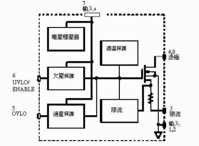 該集成器件包括用戶可選擇的欠壓和過壓保護(hù)級,以及一個可調(diào)的啟動限流,利用一個電阻就可將電流從最大值向下調(diào)。它還集成了一個內(nèi)部過熱保護(hù)電路,從而大大增加了短路和過載情況下該器件的可靠性。