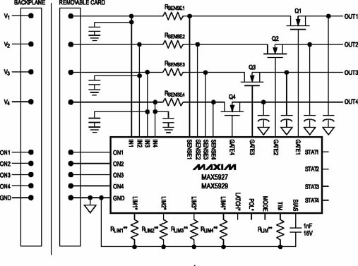 Maxim公司推出了一系列電源熱插拔控制器,適應(yīng)于各種背板電源的要求。MAX5927/5929是針對(duì)低壓電源系統(tǒng)的+1V到13.2V的四通道熱插拔控制器。在電路板熱插拔時(shí),MAX5927/5929控制輸出電壓緩慢升高,同時(shí)限制輸入電流小于預(yù)設(shè)值,避免瞬態(tài)大電流沖擊,保證了系統(tǒng)的安全性和穩(wěn)定性。圖1是典型應(yīng)用電路圖,圖2是熱插拔時(shí)的啟動(dòng)電壓、電流波形??梢钥闯?,MOSFET的柵極電壓受MAX5927/5929的控制,按照固定斜率上升,逐漸打開MOSFET,輸出到電路板的電壓也基本同步地按斜率上升,瞬態(tài)電流則始終被控制在門限值以內(nèi),避免了大的沖擊電流的出現(xiàn)。啟動(dòng)時(shí)間和電流限值都可以簡(jiǎn)單地通過一個(gè)外部電阻來設(shè)定,為設(shè)計(jì)工程師提供了極大的靈活性。