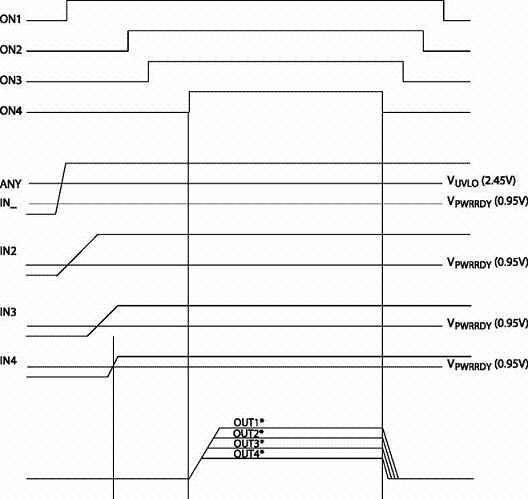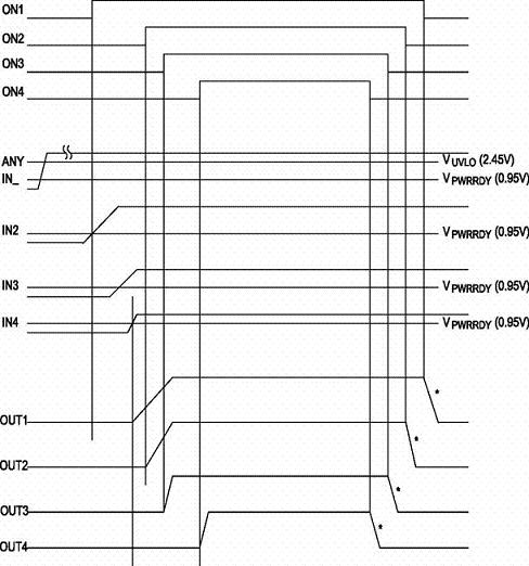 順序上電模式則根據(jù)設(shè)計(jì)者的要求,順序打開/關(guān)閉每一個(gè)通道。如果出現(xiàn)故障情況,則所有通道會(huì)被同時(shí)關(guān)閉,圖4是順序上電模式時(shí)序圖。