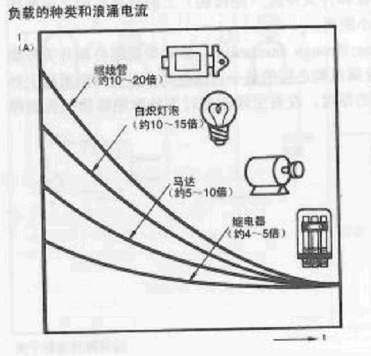 沖擊電流的產(chǎn)生和負載的種類和特性有關(guān),和通斷頻率也有關(guān)系。特別是在有沖擊電流存在的負載的情況請與穩(wěn)態(tài)電流一起測定沖擊電流值。下圖顯示了有代表性的負載種類與沖擊電流的關(guān)系。
