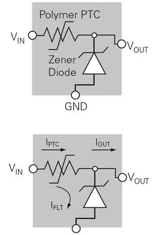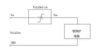 在正常工作時,VIN輸入電壓高于齊納二極管的擊穿電壓VZ,有IFLT電流經(jīng)齊納二極管到地,VOUT輸出穩(wěn)定的電壓。有不正常的過壓輸入VIN 時,則齊納二極管的IFLT會產(chǎn)生過流,當(dāng)器件上有過流時,其電阻由低阻態(tài)瞬變到高阻態(tài),使在其上的壓降大增,VOUT輸出基本不變,而流過齊納二極管的 電流IFLT反而減小,如下圖所示。器件上電壓降的增大既保護了齊納二極管,又保護了下游的電路。另外,若被保護的下游電路中存在有局部短路或短路故障 時,IOUT會增加,PPTC元件由低阻態(tài)變成高阻態(tài),可使電路得到過流保護。
