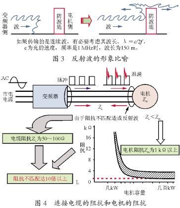 當(dāng)電機阻抗很大時,反射波與入射波正向疊加,即ZL<ZM時,反射系數(shù)=1。而且,生成與逆變器的輸出脈沖同一極性、幾乎同一大小的反射波,疊加后成為微浪涌尖峰電壓。圖3 形象地表示了反射的情況,微浪涌電壓就像海浪遇到障礙一樣被抬得很高。圖4 表示實際電纜和電機的阻抗差別,一般電機的阻抗是電纜特性阻抗的10 倍以上,所以反射總是存在。