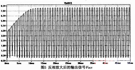 C5是防止低頻噪聲干擾的對(duì)策,加了C5后,反相放大器的放大倍數(shù)R9/R7中,R9仍為(220k Ω),R7則變成由C5(0.22 μF)和4.7kΩ合成的。電容的容抗為1/(j*w*C),對(duì)于低頻信號(hào)容抗很大,對(duì)于高頻信號(hào)接近短路,這樣對(duì)于低頻信號(hào)放大倍數(shù)較大幅度減小,而對(duì)于高頻信號(hào)放大倍數(shù)幾乎不變,起到了抑制低頻干擾信號(hào)的作用,防止了誤觸發(fā)。圖5是該電路對(duì)80mV信號(hào)放大后在PSPICE中仿真的輸出: