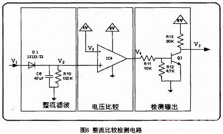 本電路共6部分組成:電源電路、電壓跟隨電路、電壓反相放大電路、低通濾波電路、比較電路、檢測(cè)輸出電路。電路圖如圖1所示: