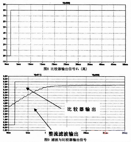 整流濾波后的信號(hào)V2,輸入到比較器IC4的正信號(hào)端,與IC4的負(fù)端電壓(V3=Vcc/2=4V))進(jìn)行比較。當(dāng)信號(hào)電平值大于4V時(shí),比較器輸出高電平(V4接近運(yùn)放的電源8V),當(dāng)信號(hào)電平值小于4V時(shí),比較器輸出低電平(V4接近0V),該兩個(gè)電平將控制后級(jí)檢測(cè)電路。圖8為AUX輸入信號(hào)后經(jīng)比較器輸出高電平的仿真輸出,圖9為濾波和比較器的仿真輸出信號(hào)。
