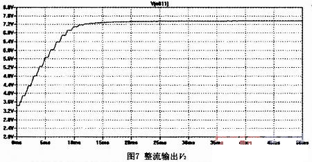 整流電路由D1、R10、C6組成(參見(jiàn)圖6)。它起到了平緩放大后信號(hào)的變化幅度,使它接近直流信號(hào)的作用。當(dāng)V1和V2之間的壓差大于二極管的導(dǎo)通電壓時(shí),二極管導(dǎo)通,對(duì)電容C6充電(同時(shí)一部分電流流過(guò)R10及比較器的輸入阻抗);當(dāng)V1和V2的壓差小于二極管的導(dǎo)通電壓時(shí),二極管截止,電容上的電荷通過(guò)R10(及比較器的輸入阻抗)放電。當(dāng)放電到V1和V2的壓差再次大于二極管的導(dǎo)通電壓時(shí),二極管導(dǎo)通,又開(kāi)始充電的過(guò)程。該電路就反復(fù)地進(jìn)行這樣的充放電過(guò)程。由于R10、C6值都很大,放電的速度很慢,電容電壓接近直流。由微分方程可得,放電時(shí)間T=RC1n(Vo/Vt),Vo為放電初始電壓,Vt為放電后的電壓,R為放電通路的電阻值,C為放電的電容值??梢?jiàn)R,C越大,放電時(shí)間越長(zhǎng),即電壓越不容易變化。圖7為整流濾波的仿真輸出。