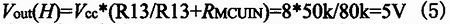 當(dāng)比較器輸出低電平,Q1截止,8V通過(guò)R13與微控芯片(MCU)相應(yīng)端口的輸入阻抗RMCUIN進(jìn)行分壓,通常MCU相應(yīng)端口的輸入阻抗RMCUIN≈ 50kΩ,則輸出高電平可以由如下計(jì)算得到: