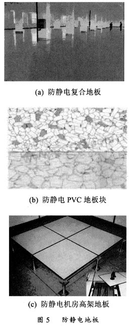 (4)防靜電地板:防靜電地板也有多種,按時(shí)效性分,有永久性和臨時(shí)性;按材料分有導(dǎo)電橡膠、PVC、導(dǎo)電陶瓷等;按鋪設(shè)方式分,有地面直接鋪設(shè)的和架空的活動(dòng)地板??筛鶕?jù)實(shí)際需要和成本決定。如需要在地面走多種電纜、管道的環(huán)境如計(jì)算機(jī)房選擇架空鋪設(shè)的活動(dòng)地板比較好。圖5是一些防靜電地板。