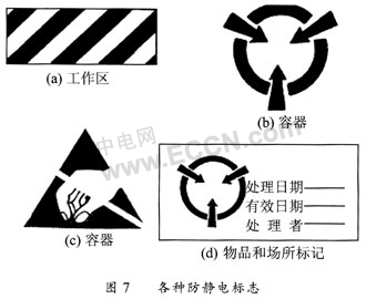 (2)張貼醒目的靜電敏感器件標(biāo)志,圖7是各種防靜電標(biāo)志。其中(a)是防靜電工作區(qū)的標(biāo)志,(b)和(c)是防靜電容器、元件架、運(yùn)輸車(chē)等器材上的標(biāo)記;(d)是經(jīng)防靜電處理的物品和場(chǎng)所的標(biāo)記;