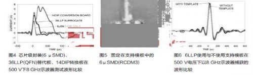 已經(jīng)在三種條件下使用6 μSMD 裸片來(lái)進(jìn)行CDM測(cè)試:僅器件本身、器件貼裝在14DIP轉(zhuǎn)換板上,以及在36LLP替代板(Surrogate Board)上,如圖3所示。圖4顯示了這三種條件下以500 V電壓采用8 GHz示波器所獲得的CDM測(cè)試波形。這些結(jié)果顯示,貼裝在電路板上會(huì)增加施加給集成電路的應(yīng)力。36LLP替代板上應(yīng)力的增加頗為適度,可以視為易于操作性與更可靠測(cè)試結(jié)果之間的最佳折衷。貼裝在14DIP轉(zhuǎn)換板上的應(yīng)力增加更為嚴(yán)重,大概不是一個(gè)可接受的折衷辦法。好消息是36LLP替代板實(shí)際上比測(cè)試期間會(huì)移動(dòng)的14DIP轉(zhuǎn)換板更易于操作。