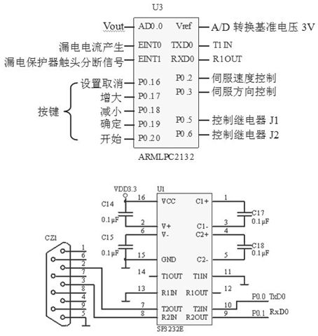 由于A/D轉(zhuǎn)換為10位,當(dāng)輸入電壓為5V時(shí),輸出數(shù)據(jù)值為1024(4FFH),因此最大分辨率為0.0049V(5V/1024)。若產(chǎn)生測(cè)試電流的回路電阻為12Ω時(shí),漏電電流的分辨率為0.4mA(0.0049V/12Ω),完全滿足測(cè)試需要。漏電保護(hù)器的漏電電流產(chǎn)生的開始信號(hào)和動(dòng)、靜觸頭斷開信號(hào)分別送入LPC2132的外部中斷輸入端,采用中斷的方式對(duì)漏電保護(hù)器動(dòng)、靜觸頭的分?jǐn)鄷r(shí)間進(jìn)行檢測(cè)。P0.5與P0.6腳分別控制繼電器J1、J2的閉合和分?jǐn)?,選擇三種不同測(cè)量范圍的測(cè)試電流。LPC2132與上位機(jī)之間采用串行通信,由于系統(tǒng)是3.3V系統(tǒng),所以要使用SP3232E進(jìn)行RS-232電平轉(zhuǎn)換。SP3232E是3V工作電源的RS-232轉(zhuǎn)換芯片。A/D轉(zhuǎn)換及控制電路如圖4所示。