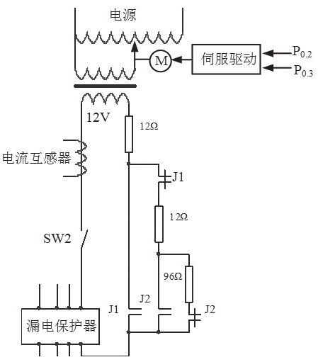 測(cè)試電流產(chǎn)生和調(diào)節(jié)模塊如圖2所示。測(cè)試電流的產(chǎn)生是將50Hz、220V的正弦交流電經(jīng)過220:12的降壓變壓器和電動(dòng)調(diào)壓器,輸出0~12V的正弦交流電,再通過回路電阻,產(chǎn)生需要的測(cè)試電流。測(cè)試電流的產(chǎn)生分為3檔,以滿足不同的測(cè)量范圍。繼電器J1吸合,可產(chǎn)生0~1000mA的測(cè)試電流;繼電器J2吸合,可產(chǎn)生0~500mA的測(cè)試電流;繼電器J1、J2都不吸合,可產(chǎn)生0~100mA的測(cè)試電流。每一檔測(cè)試電流的調(diào)節(jié)通過LPC2132控制電動(dòng)調(diào)壓器實(shí)現(xiàn)。為了使測(cè)試電流能均勻地變化,電動(dòng)調(diào)壓器采用了交流伺服控制。在測(cè)試過程中,LPC2132對(duì)采集到的實(shí)時(shí)回路中的測(cè)試電流值與設(shè)定值比較,并計(jì)算得到控制量,控制伺服電動(dòng)機(jī)轉(zhuǎn)動(dòng),帶動(dòng)電動(dòng)調(diào)壓器的電刷在副邊上穩(wěn)定地滑動(dòng),使副邊電壓變化,從而改變回路中的電流。LPC2132的P0.2腳輸出脈沖信號(hào)控制伺服電動(dòng)機(jī)的運(yùn)動(dòng)速度,P0.3腳輸出高或低的電平信號(hào),控制伺服電動(dòng)機(jī)轉(zhuǎn)動(dòng)的方向。