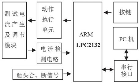 系統(tǒng)以LPC2132為核心,具有擴(kuò)展測(cè)試電流的產(chǎn)生和調(diào)節(jié)模塊、動(dòng)作執(zhí)行單元、電流檢測(cè)電路以及鍵盤等外圍設(shè)備。LPC2132是一個(gè)支持實(shí)時(shí)仿真和跟蹤32位ARM7TDMI-S核的微控制器,1個(gè)10位8路A/D轉(zhuǎn)換器,2個(gè)32位定時(shí)器/計(jì)數(shù)器,6路PWM單元輸出,2個(gè)硬件I2C接口和47個(gè)GPIO,2個(gè)16C550工業(yè)標(biāo)準(zhǔn)UART,以及多達(dá)9個(gè)邊沿或電平觸發(fā)的外部中斷。16kB的片內(nèi)靜態(tài)RAM和64kB的片內(nèi)Flash程序存儲(chǔ)器避免了LPC2132外擴(kuò)存儲(chǔ)器,簡(jiǎn)化了電路,提高了運(yùn)行速度。漏電保護(hù)器的動(dòng)作特性自動(dòng)測(cè)試系統(tǒng)結(jié)構(gòu)框圖如圖1所示。