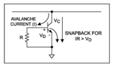 雙極型IC的箝位電路類似于在受保護核電路中提供一個受沖擊時擊穿的部件,圖3給出了圖1中箝位功能的詳細電路。箝位晶體管的過壓導致集電極-基極之間的雪崩電流,發(fā)射結的正向偏置會進一步提高集電極電流,導致一個“突變”過程。箝位時的V-I特性曲線如圖4所示。
