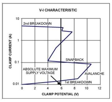 箝位電壓從第一次擊穿變化到突變穩(wěn)定后的導通電壓,如圖5所示。為保證箝位時關閉正常的工作條件,設計的箝位電壓一般要略高于IC的絕對最大電壓。