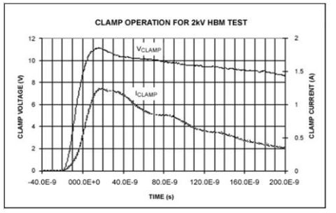箝位二極管在IC其它電路遭到破壞之前導通,箝位管要有足夠的承受力,保證ESD電流不會導致二次擊穿。2kV HBM測試的箝位過程如圖5所示,圖5中的電壓包括I-R壓降和突變穩(wěn)定后的箝位電壓。