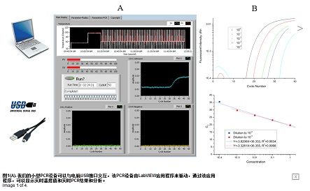 利用該系統(tǒng)同時運行包含預(yù)加載PCR反應(yīng)物的三個聚合物,從抽樣到結(jié)果所花費時間不到一小時,并且允許采用大量生物的多樣性。利用熱敏電阻的實時溫度反饋,一個內(nèi)部比例積分微分(PID)芯片來處理溫度控制。該控制器由一個補償器,輸出裝置和傳感器反饋信號組成,反饋信號對于控制加熱器輸出功率,以及保持溫度是很必要的。使用LabVIEW軟件,我們對圖形用戶接口進(jìn)行編程,以顯示實時溫度,設(shè)置溫度,并且顯示來自三個通道的實時PCR結(jié)果 (如圖1A所示)。