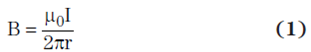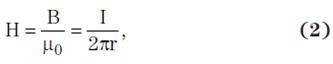 其中,B 為以第平方米伏秒 (V•s/m2) 表示的磁通密度,μ0 為自由空間中的磁導(dǎo)率(計算方法為 4π × 10–7 V•s/A•m),I 為以安培為單位的電流,r 為以米為單位的導(dǎo)體距離,而 H 為以安培每米 (A/m) 為單位的磁場強(qiáng)度。
