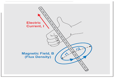 諸如電動機(jī)的電源線等帶電導(dǎo)體,其周圍便是一個由流經(jīng)它的電流形成的磁場。應(yīng)用右手定則(請參見圖 1),我們很容易便可以確定該磁場的方向。該定則的內(nèi)容如下:用右手握住導(dǎo)體,然后拇指指向電流的方向,這時環(huán)繞導(dǎo)體的手指便指向磁場的方向。因此,磁通線的平面始終與電流垂直。