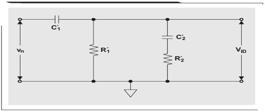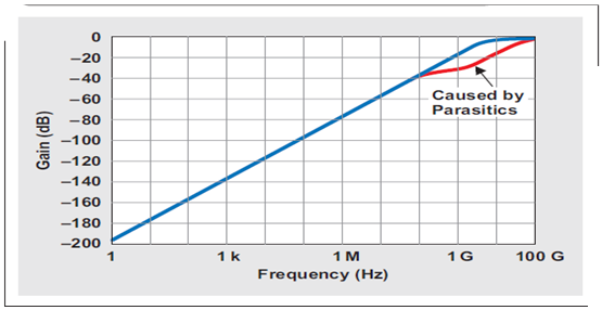 一次電路仿真證實了 RC 網(wǎng)絡(luò)為一個一階高通濾波器,其 C′1 和 R′1 為主要組件,頻率高達(dá) 100 MHz(參見圖 5 中藍(lán)色曲線)。超出這一頻率以后,寄生組件 C′2 和R′2生效,從而引起稍稍偏離于線性的斜率。因此,頻率達(dá)到 100 MHz 以后,增益響應(yīng)可以表示為 VID/vn 的比: