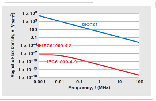 超出電容隔離器差動電路噪聲預(yù)算的磁耦合要求 1MHz 下大于 11.7 V•s/m2(117千高斯) 的磁通量密度。這需要在一個距離器件 0.1m 的導(dǎo)體中有超過 5 百萬安的電流才能產(chǎn)生這樣一個磁場。在自然界或者任何制造設(shè)備中這都是不可能存在的。如果的確存在,那么設(shè)計人員便可做以下情況假設(shè):在隔離層失效以前,周圍的電路便都已失效。