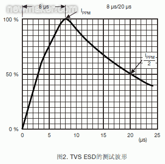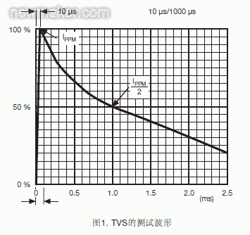 TVS的額定功率是在一定測(cè)試或應(yīng)用條件下吸收浪涌的能力。10μs/1000μs脈沖波形的工業(yè)標(biāo)準(zhǔn)測(cè)試條件(Bellcore 1089標(biāo)準(zhǔn))如圖1所示。這個(gè)測(cè)試條件不同于8μs/20μs脈沖波形的TVS瞬態(tài)電壓吸收能力測(cè)試條件,如圖2所示。