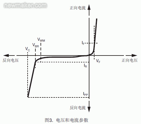 斷態(tài)電壓指的是TVS在未擊穿情況下所能承受的最高電壓,它是在正常情況下不工作電路中保護(hù)器件的重要參數(shù)。在汽車中,一些汽車電子產(chǎn)品規(guī)范是根據(jù)“跳線跨接起動(dòng)保護(hù)”的情況制定的。這種情況要求為12V類型電子設(shè)備提供10分鐘24VDC,或?yàn)?4V類型電子設(shè)備提供10分鐘36VDC,而不損壞電路或者引起電路故障。因此,斷態(tài)電壓是汽車電子產(chǎn)品中TVS的一項(xiàng)關(guān)鍵參數(shù)。