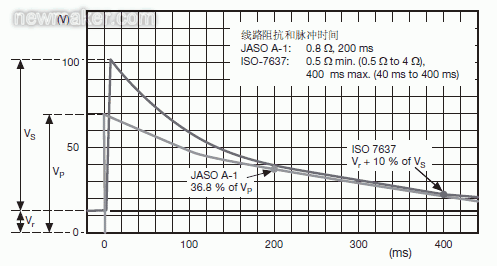 兩個(gè)熟知的試驗(yàn)?zāi)M了這個(gè)條件:針對(duì)14V動(dòng)力總成的美國ISO-7637-2 Pulse 5和日本JASO A-1和針對(duì)27V動(dòng)力總成的JASO D-1。在本節(jié)中,我們將回顧在14V動(dòng)力總成中用于甩負(fù)荷的TVS應(yīng)用。