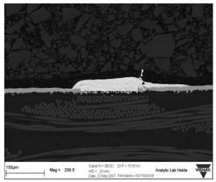 厚膜電阻的使用經(jīng)驗(yàn)表明,短時(shí)過(guò)載、焊接熱等熱應(yīng)力和脈沖應(yīng)力會(huì)使阻值發(fā)生漂移。這些在貼片式保險(xiǎn)絲里發(fā)生的現(xiàn)象將會(huì)改變保險(xiǎn)絲的特性,進(jìn)而縮短熔斷時(shí)間。雖然熔體使用了幾種不同的材料,例如銅錫合金,可以達(dá)到高水平的I2T,但在持續(xù)的熱應(yīng)力之后,熔體對(duì)斷開(kāi)時(shí)間的縮短是非常敏感的。這是由于應(yīng)力會(huì)導(dǎo)致熔體組成材料的遷移,如圖2所示,該圖顯示了在施加脈沖負(fù)載應(yīng)力之后,銅錫合金正在發(fā)生遷移的情況。