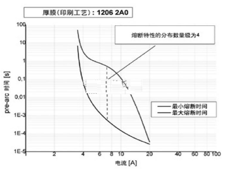 在設(shè)計(jì)階段,電子工程師會(huì)碰到熔斷特性大幅變化的情況。一般來(lái)說(shuō),貼片式保險(xiǎn)絲是低阻值的電阻,其阻值只有幾歐姆。如上所述,熔融特性與電阻值有關(guān)。如果電阻值的變化范圍很大,熔融特性也就相應(yīng)地有很大變化。由于這種可能發(fā)生的變化,貼片式保險(xiǎn)絲在碰到正常的涌流時(shí)就斷開(kāi),或是相反,在過(guò)載情況下,應(yīng)該斷開(kāi)時(shí)卻不斷開(kāi),這種最糟糕的情形是工程師必須避免的。圖3所示為印刷厚膜保險(xiǎn)絲的熔斷特性典型分布。